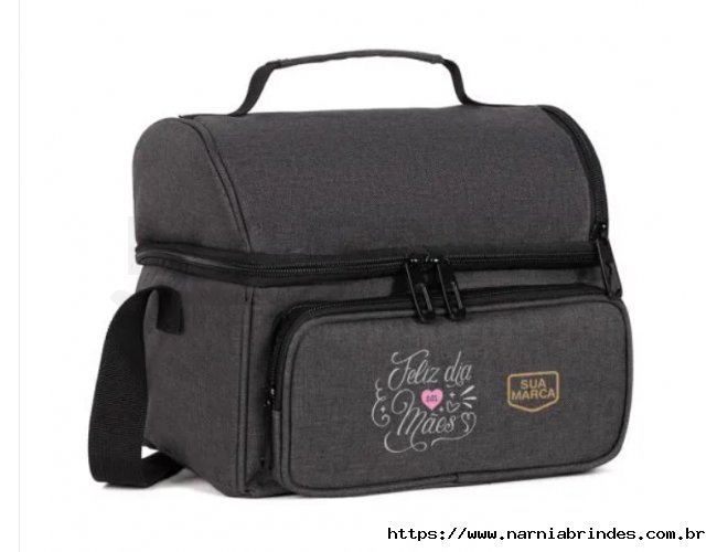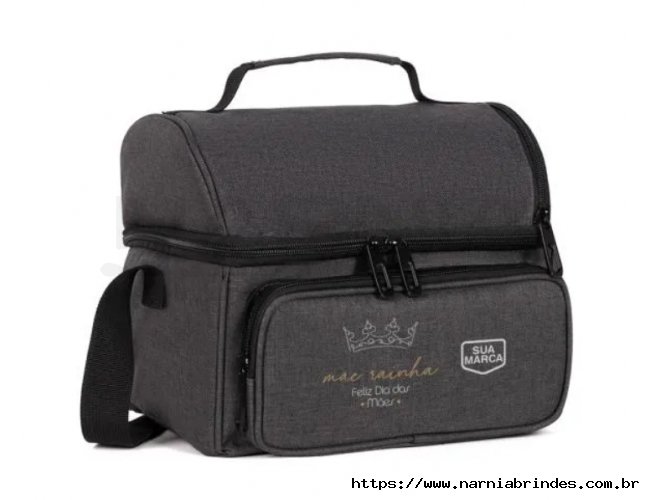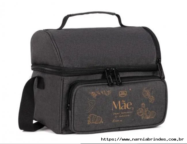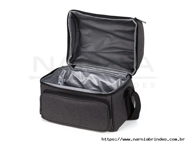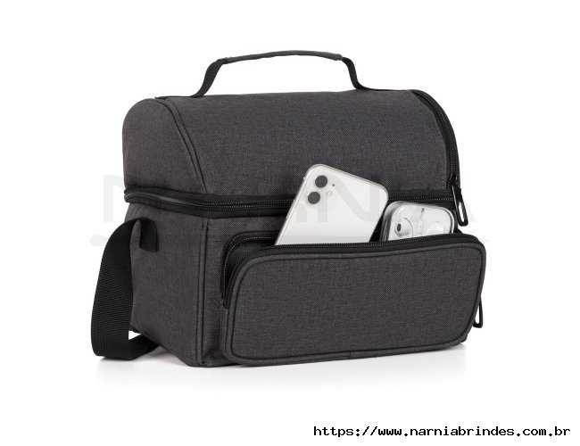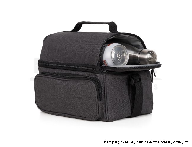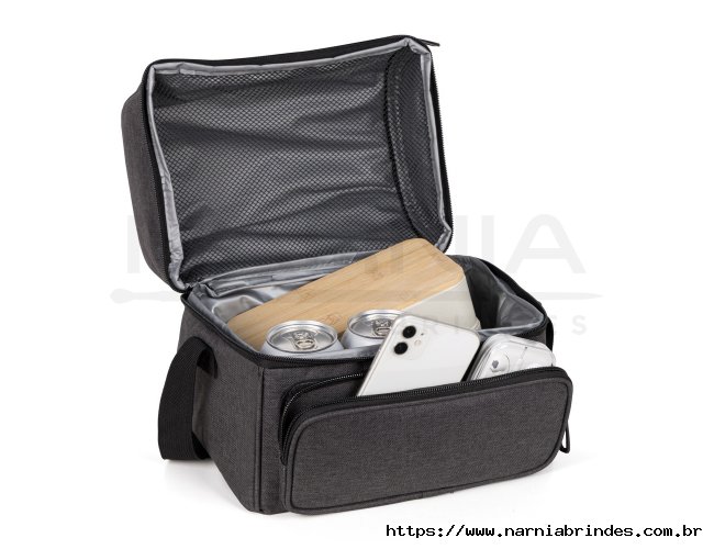 Bolsa térmica cinza escuro em RPET. Conta com dois compartimentos, sendo um frontal e outro principal em material térmico com redinha para melhor divisão e organização, ambos com fecho em zíper. Conta também com alça de mão e alça ajustável.