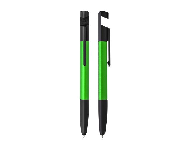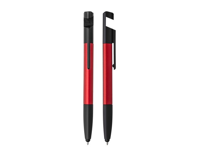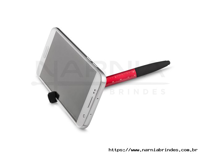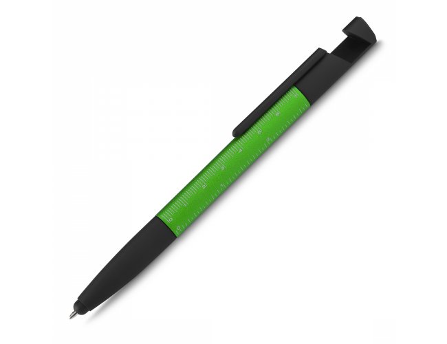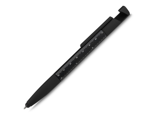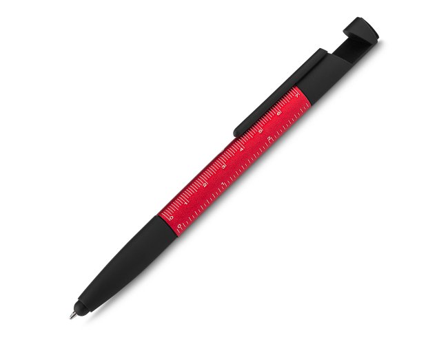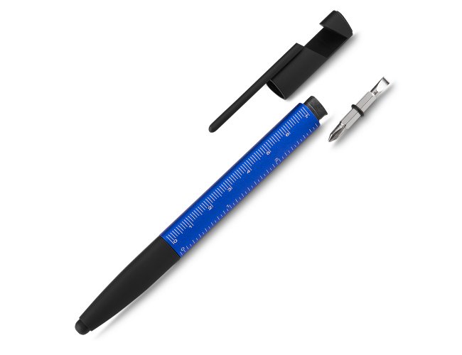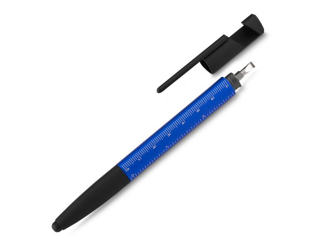 Caneta esferográfica metálica com escrita azul, ponta touch e funções integradas: chave de Fenda e Phillips, Suporte para smartphone, limpador de tela no acionador e régua no corpo da caneta.