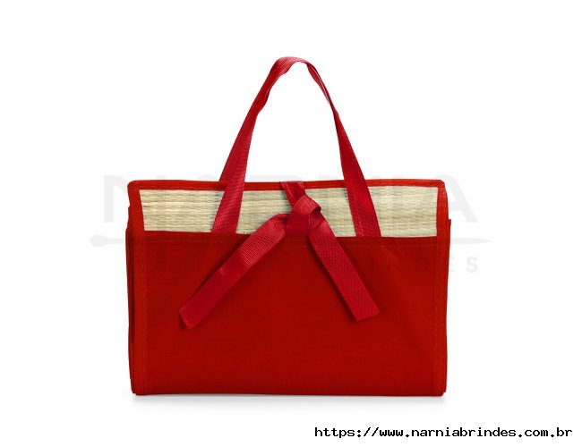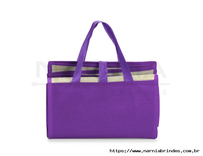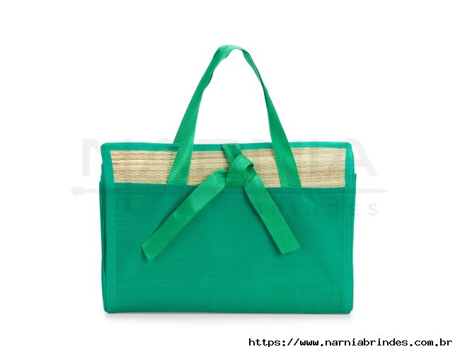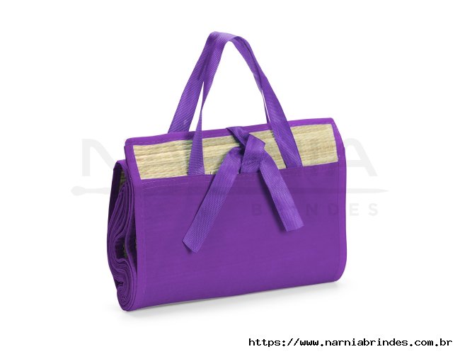 Esteira dobrável em palha sintética com bordas costuradas em nylon dividindo a esteira em três partes. Além disso, possui um par de alças costuradas para transporte.