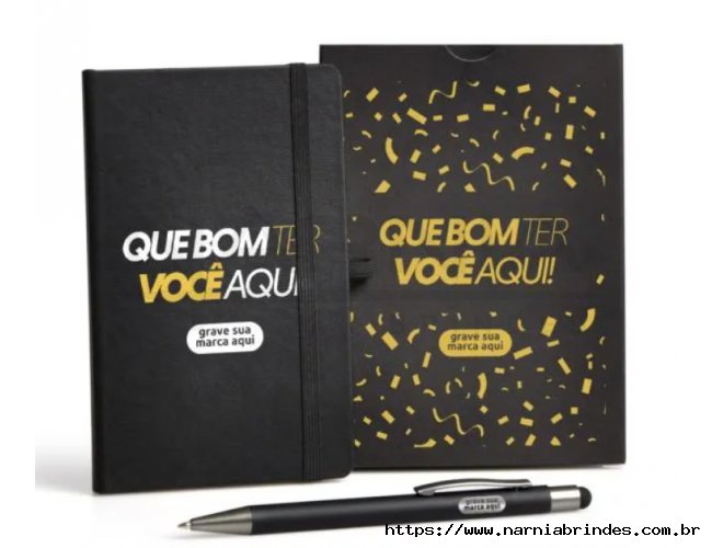 Kit Onboarding - Caderneta para anotações com caneta. A caderneta conta com 80 folhas não pautadas, suporte para caneta e elástico para fechamento. Caneta esferográfica em Alumínio. Conta com acabamento fosco, clipe e ponteira touch em silicone preto. Carga esferográfica azul acionada por um click na extremidade da caneta.