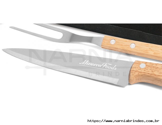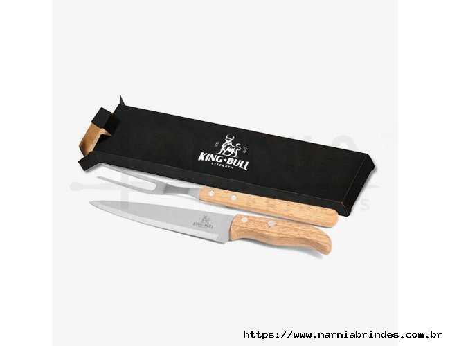 Conjunto de Faca em Madeira/Aço Inox; Acompanha faca 7'', garfo em Madeira/Inox e caixa para presente. Como cortesia, fazemos uma gravação na lâmina da faca com os cortes do boi.