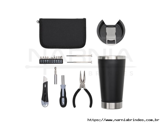 Kit copo térmico e conjunto de ferramentas. Composto por copo térmico com tampa e abridor de garrafa, confeccionado com dupla parede de inox, isolada a vácuo. Conta com alicate de bico; chave com dez peças de ponteiras + extensor, sendo quatro phillips, duas fendas, três torx e adaptador; duas chaves de precisão, sendo uma phillips e uma fenda; estilete; estojo em nylon com fechamento em zíper.