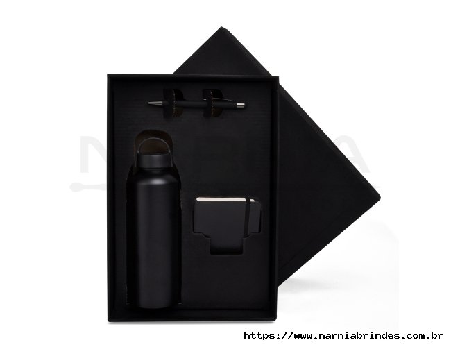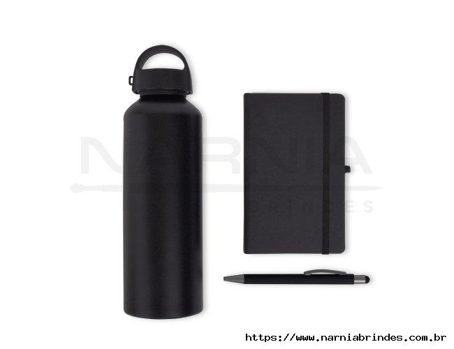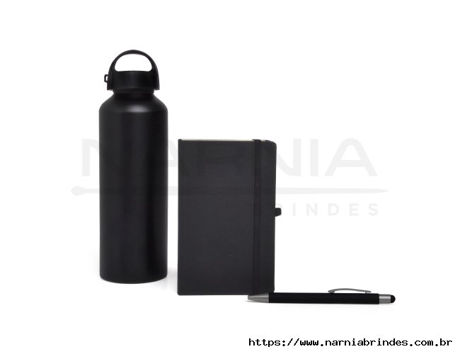 Kit escritório conta com garrafa preta em alumínio com capacidade de 600 ml; caderno para anotações preto com capa dura e caneta esferográfica em alumínio preta.