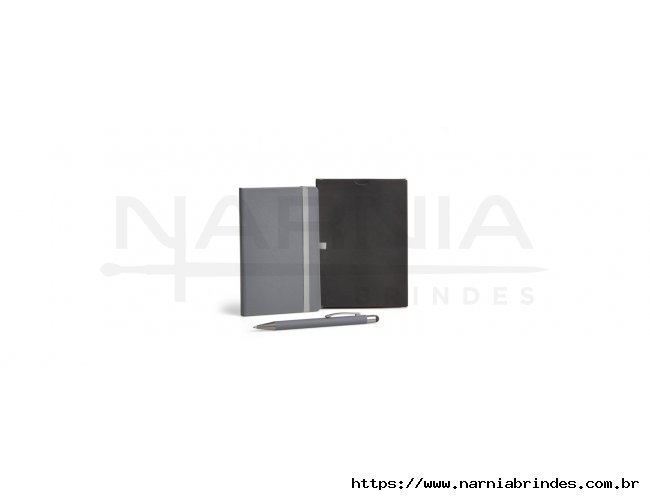 Caderneta para anotações com caneta. A caderneta conta com 80 folhas não pautadas, suporte para caneta e elástico para fechamento. Caneta esferográfica em Alumínio. Conta com acabamento fosco, clipe e ponteira touch em silicone preto. Carga esferográfica azul acionada por um click na extremidade da caneta.