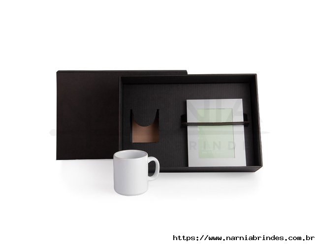 Kit contendo caneca em cerâmica na cor branca com capacidade de 270 ml e porta-retrato em alumínio fosco com vidro frontal, apoio em polipropileno preto e uma fina espuma no interior para acomodar melhor a foto.