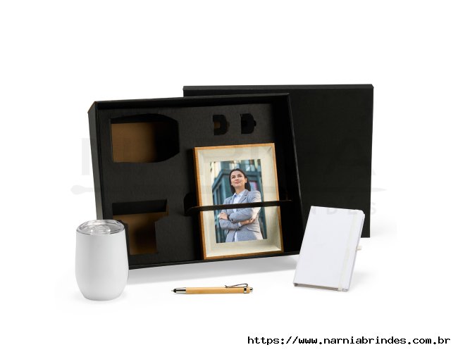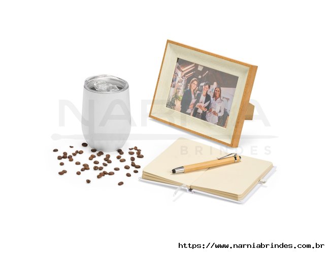 Composto por copo térmico branco com tampa 340ml; porta retrato em mdf; caderno para anotações branco com capa dura; caneta esferográfica em Bambu com ponta touch.