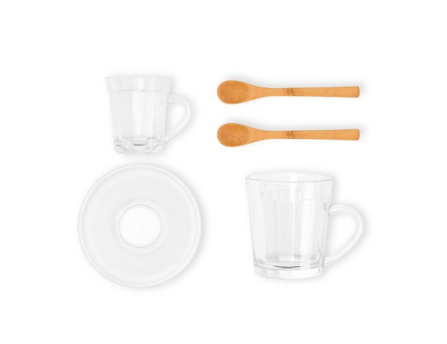 Kit composto por caneca americano e xícara express americano com pires em vidro. Conta também com duas colheres de 13 cm em Bambu.
