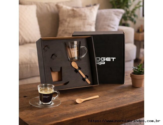 Sugestão de Personalização - Uma gravação a Laser na caneca e xícara; uma gravação em Silk/Digital na tampa da caixa.