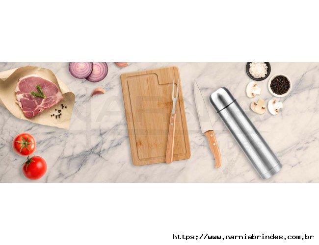 Kit para Churrasco com garrafa térmica. Composto por tábua em Bambu; faca 7" em Bambu/Inox; garfo trinchante em Madeira/Inox e garrafa térmica em aço Inox com tampa e bolsa.