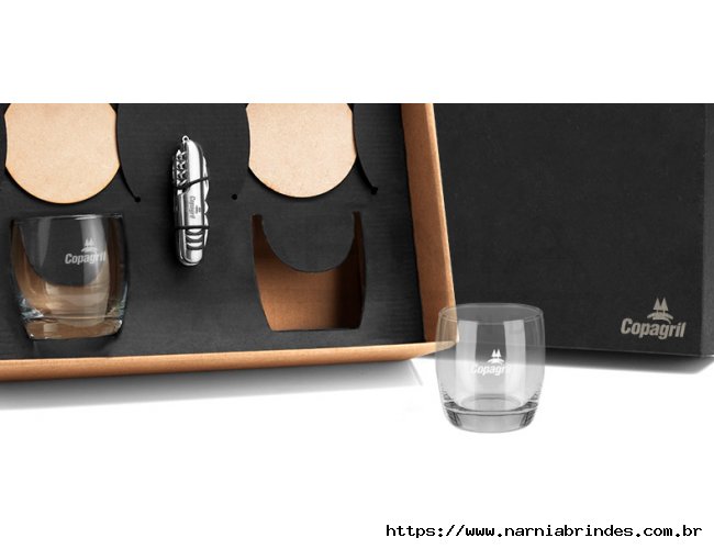 Kit whisky. Conta com dois copos em vidro; Canivete em aço inox; Dois porta copos em MDF. Estão perfeitamente acomodados em uma caixa para presentear.
