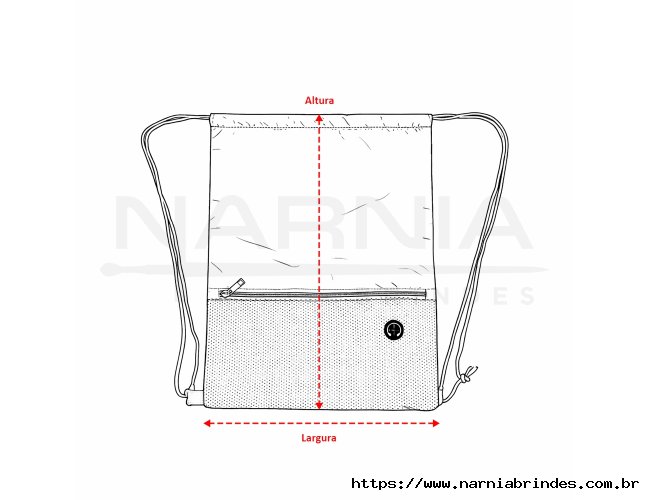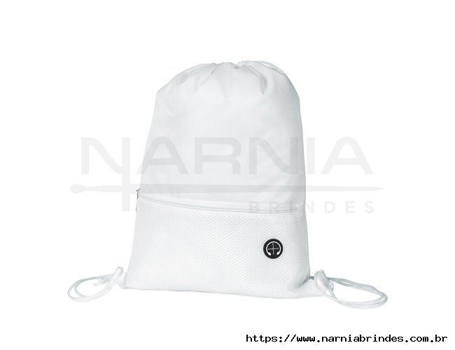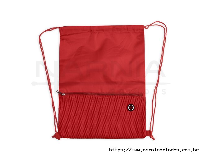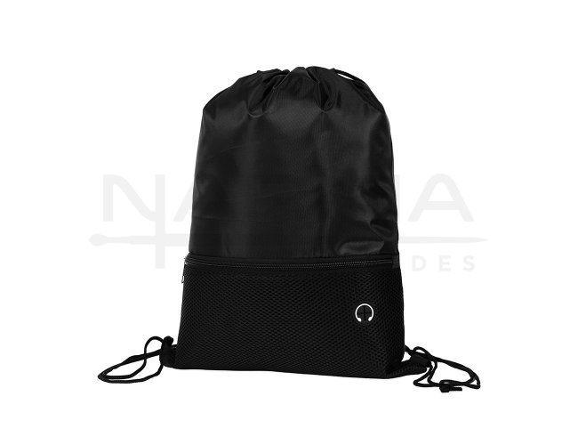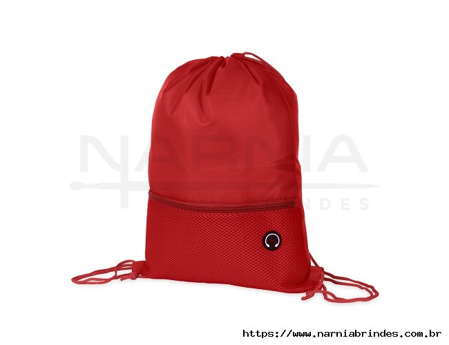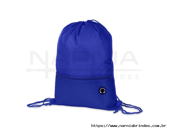 Mochila saco confeccionada em poliéster 420D com bolso externo em malha com entrada para fones de ouvido e alças ajustáveis em nylon.